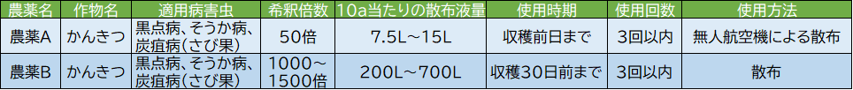 そのため、農薬Bはドローンで使用できない農薬ではないものの、作業効率の面から現実的ではないと言えるでしょう。